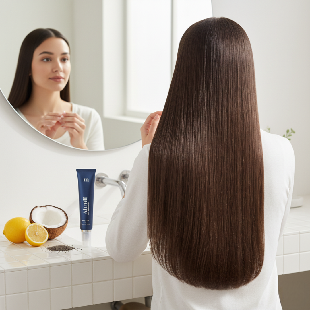 Le sérum réparateur Alundi agit directement sur les pointes pour retenir ta longueur, restaurer la fibre et redonner un aspect lisse et soyeux, sans effet gras.